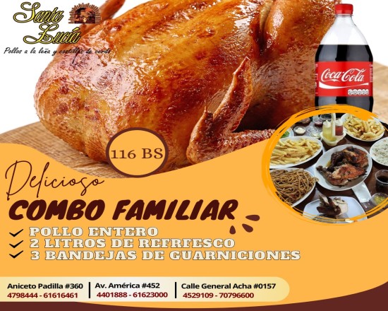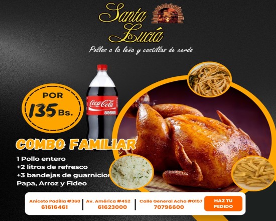 Con el propósito de brindar a la población cochabambina una nueva opción gastronómica, y un servicio de primera; Pollos Santa Lucía inicio sus servicios desde julio del 2009, trayendo consigo un nuevo y único sabor en pollos y costillas de cerdo a la leña y además comprometiéndonos con nuestra clientela.